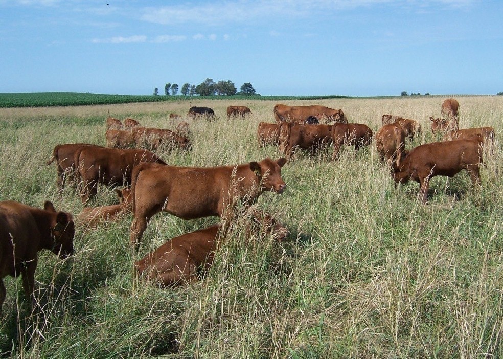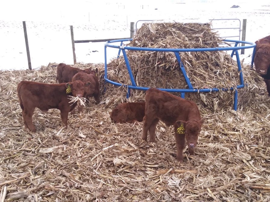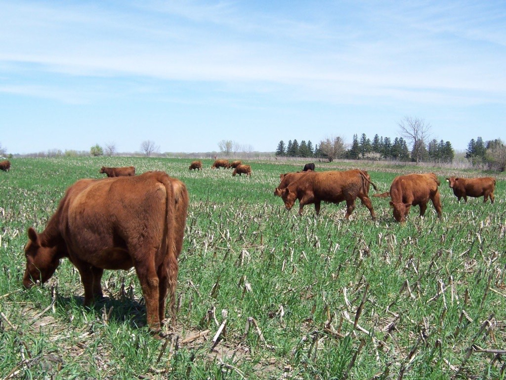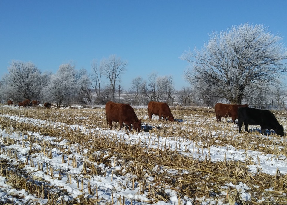 Our cows are wintered on corn stalk fields as long as weather permits, then fed a corn silage, corn stover, and DDGs ration through calving. About May first the cow/calf pairs are moved to rotationally grazed grass and alfalfa pastures.