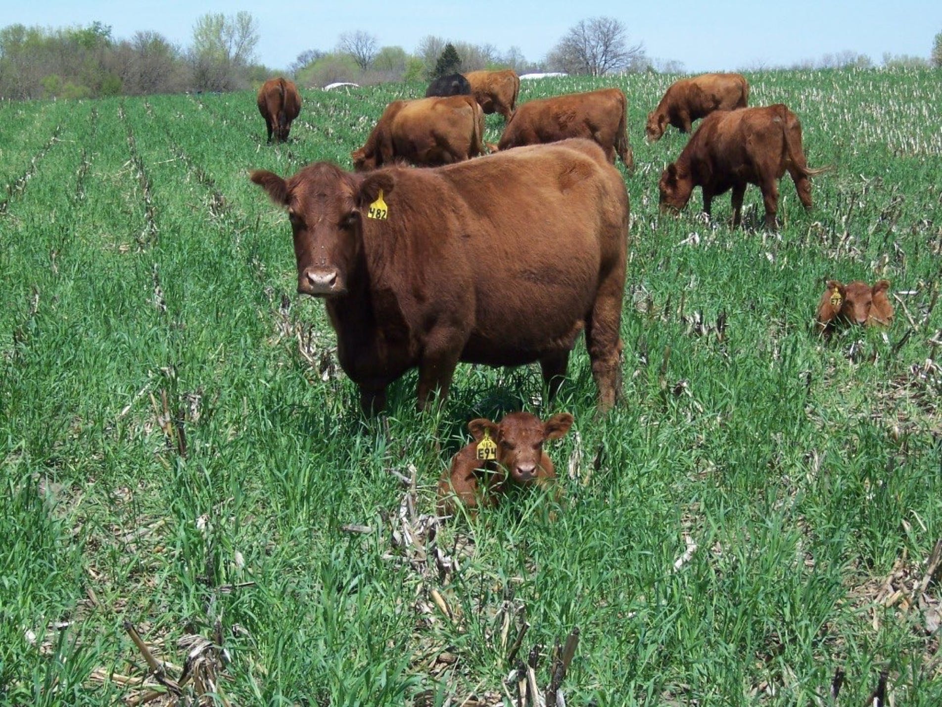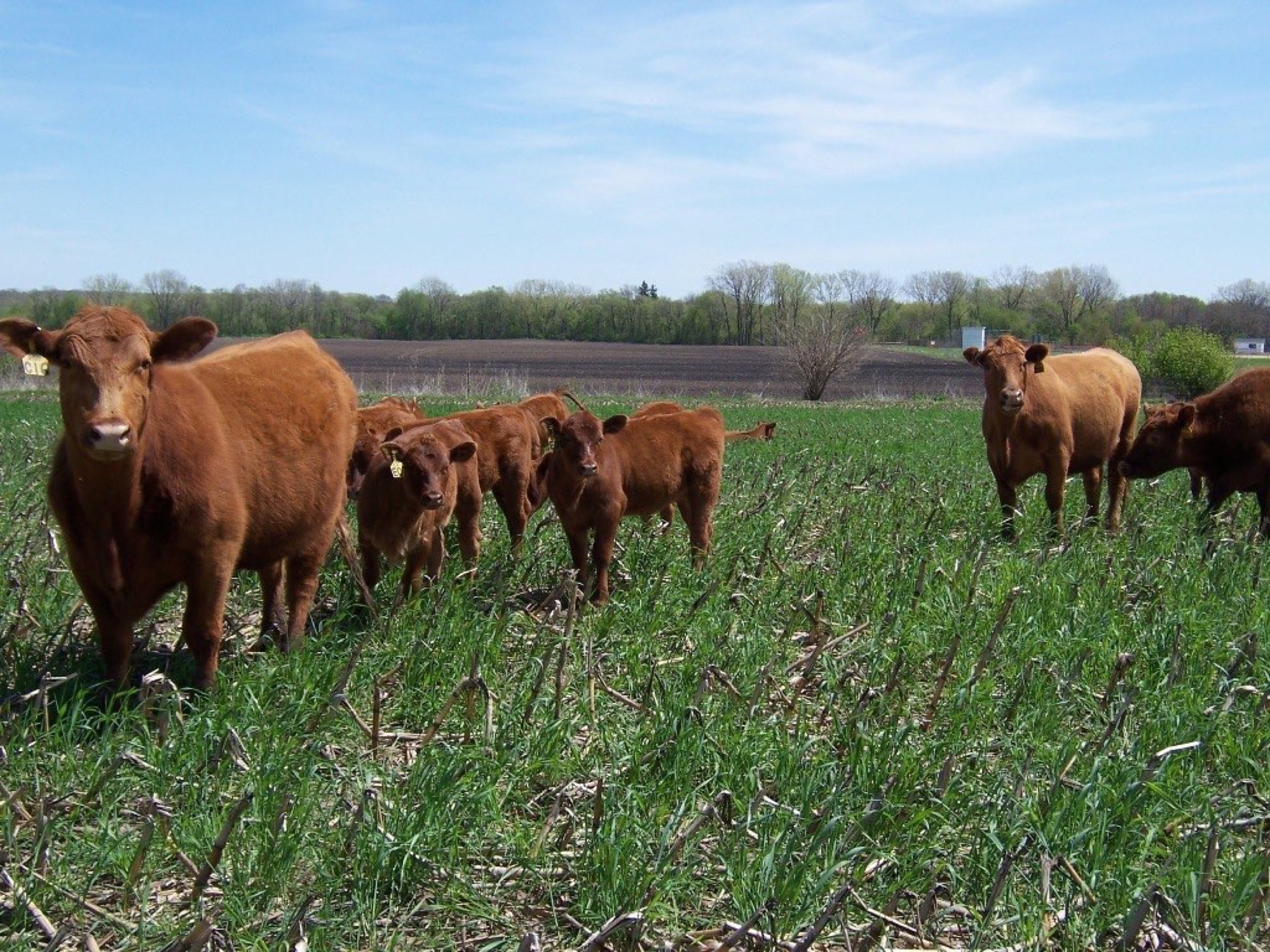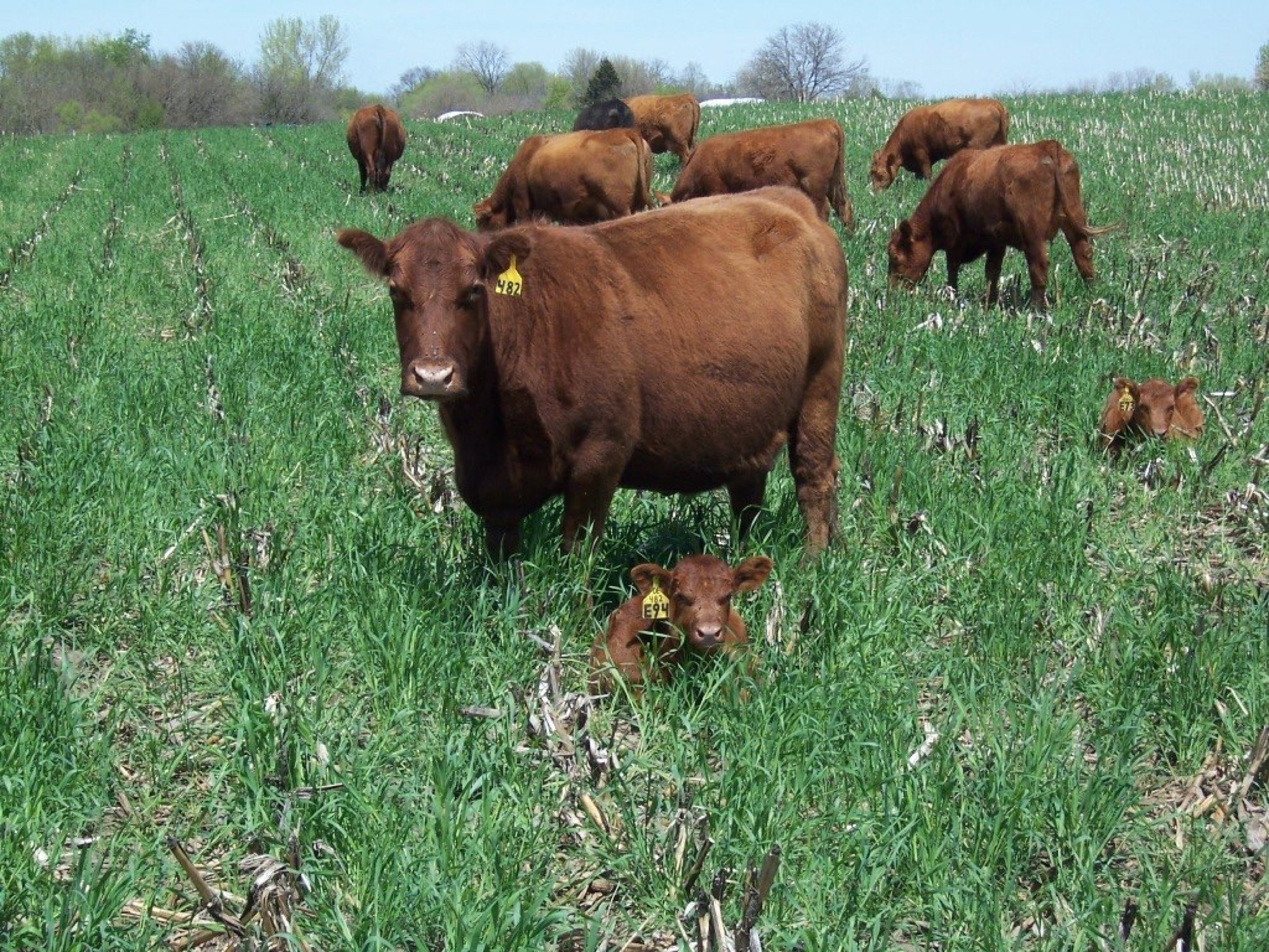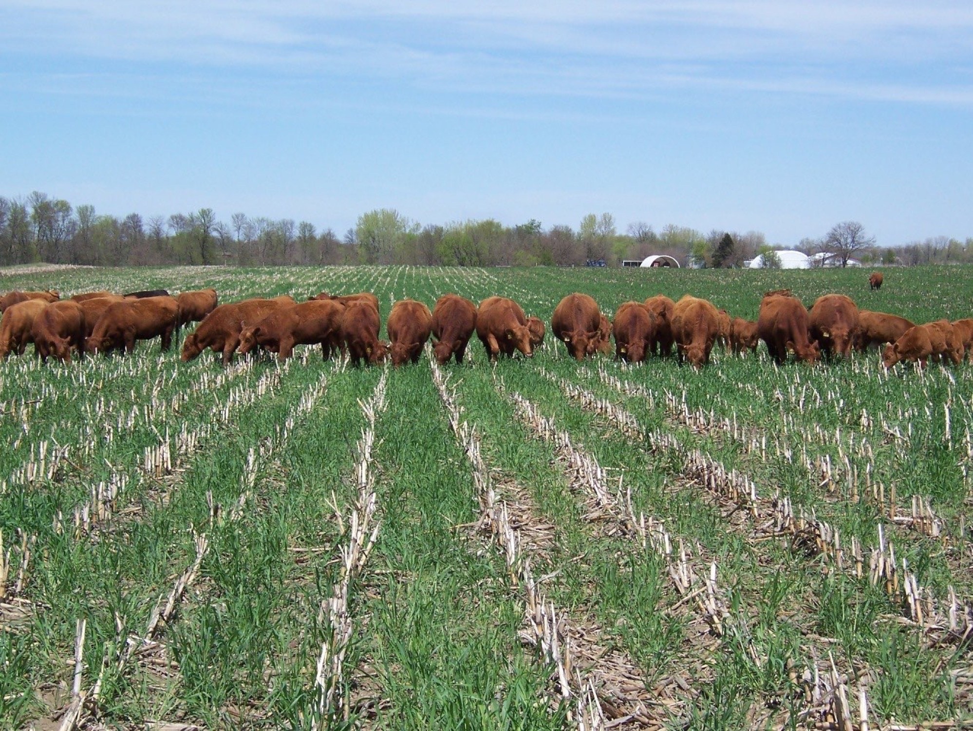 As we live in corn country, pasture land is hard to find, but we have incorporated crop residue grazing into our management practices as long as Gene has had cows. In recent years, we have been using more cover crops, usually rye, and trying different ways to utilize those for cattle feed as well. We have grazed the rye in the fall with the corn stalks, baled rye hay in the spring, chopped ryelage in the spring, and grazed the rye with pairs in the spring. These pairs grazed from mid-April until early May 2017, when they moved to our regular rotational grazing pastures, and then this field was no-till drilled with soybeans.