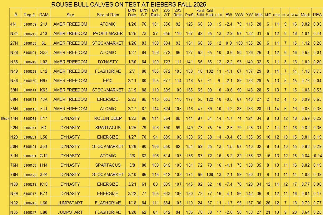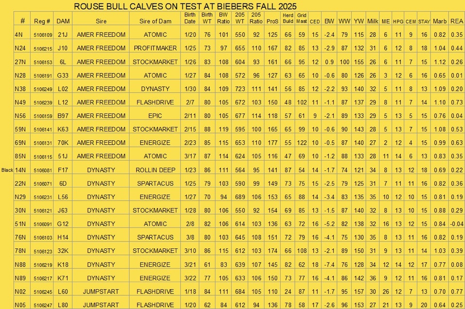 The following set of bulls were sent to Bieber Red Angus September 1st and will be gain tested there. They will sell in the Bieber Fever Spring Production Sale on March 5, 2026. We would be happy to visit with you about the bulls before the sale.