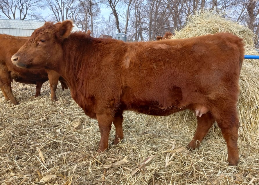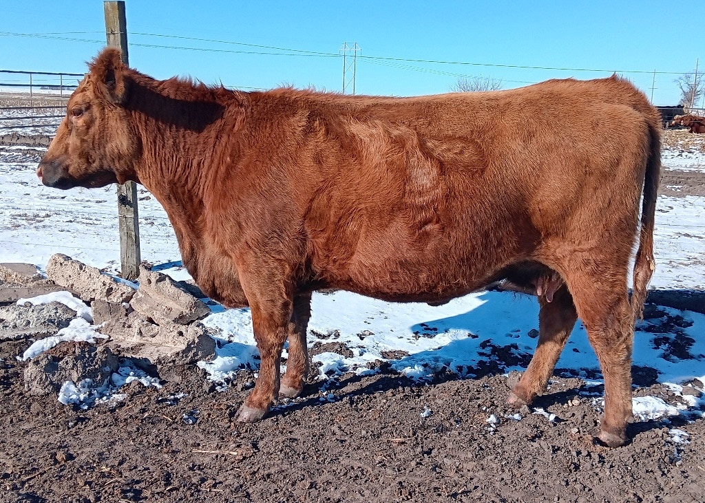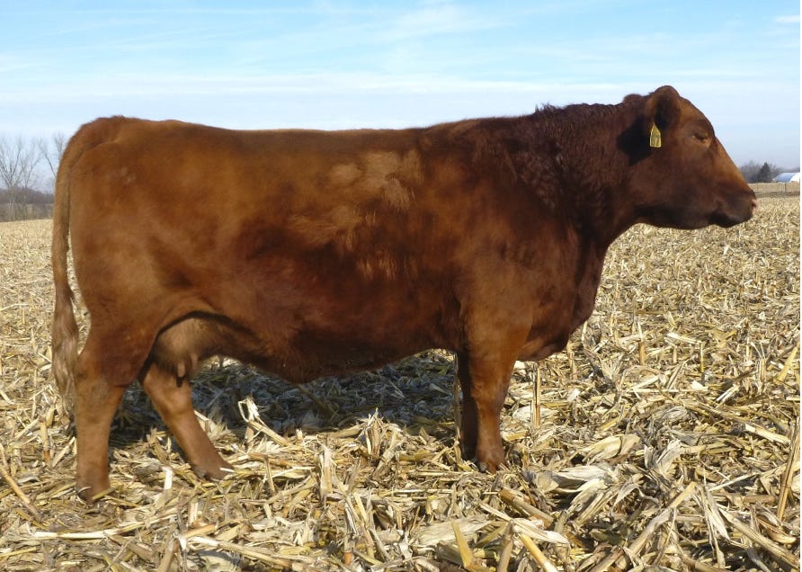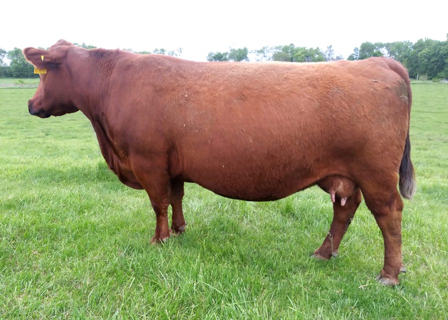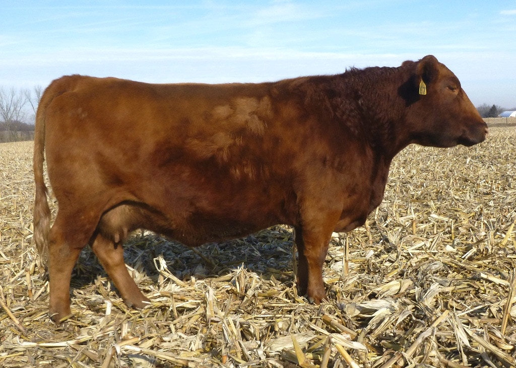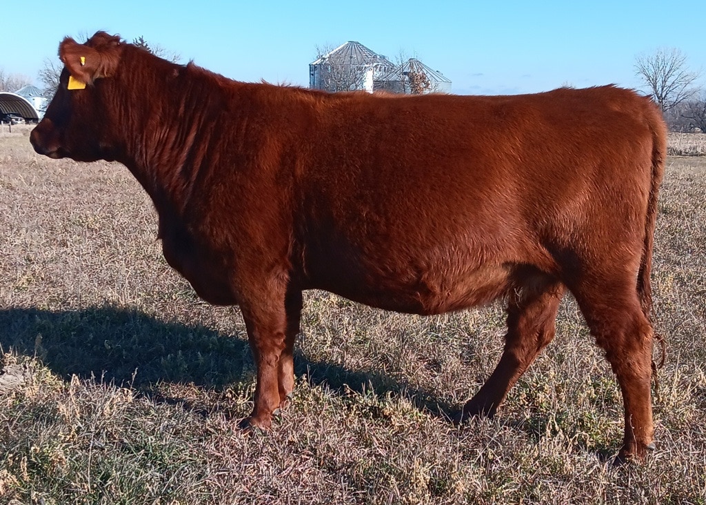 1J is another black, red carrier cow from the Allicia family, which all trace back to the high marbling Angus cow purchased from the Iowa State University Beef Teaching Herd. 1J is not only the highest marbling cow in our herd, but she is one of the highest in the entire Red Angus breed. She posted over a 9% IMF ultrasound measurement, and has one of the top marbling EPDs in the Red Angus breed. She has so much more to offer than just marbling, though, with excellent calving ease, growth, stayability, and even REA. Phenotypically, she is moderate framed, has been an easy keeper, has good feet and an excellent udder, and a great disposition. I just wish she had come out red. Even as a black cow, she has put herself on the fast track to being a donor, and we hope to get a number of great red daughters from her to make the Allicia cow family a bigger part of our red herd. She was flushed to BB Propulsion 9096 with heifer sexed semen.
