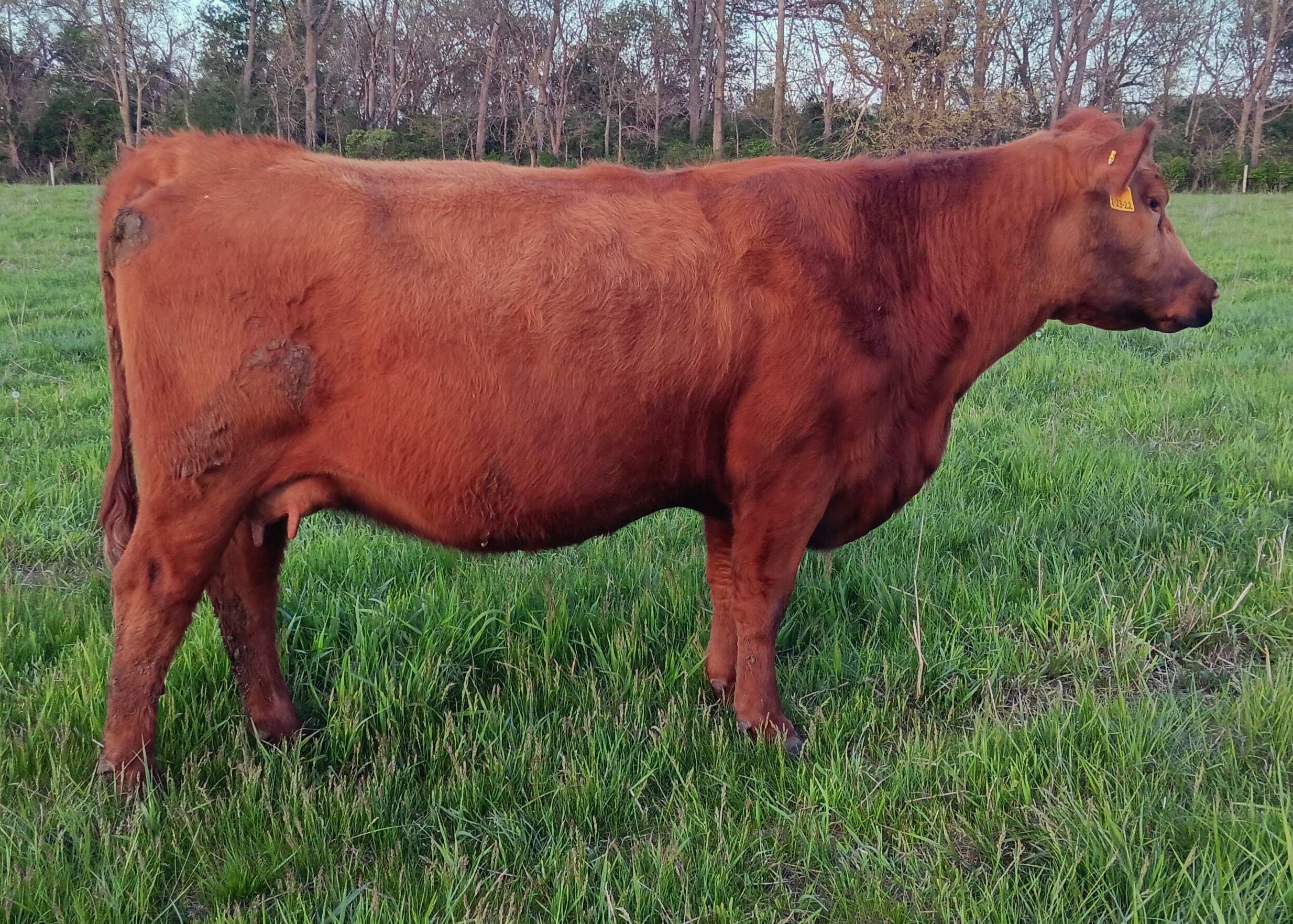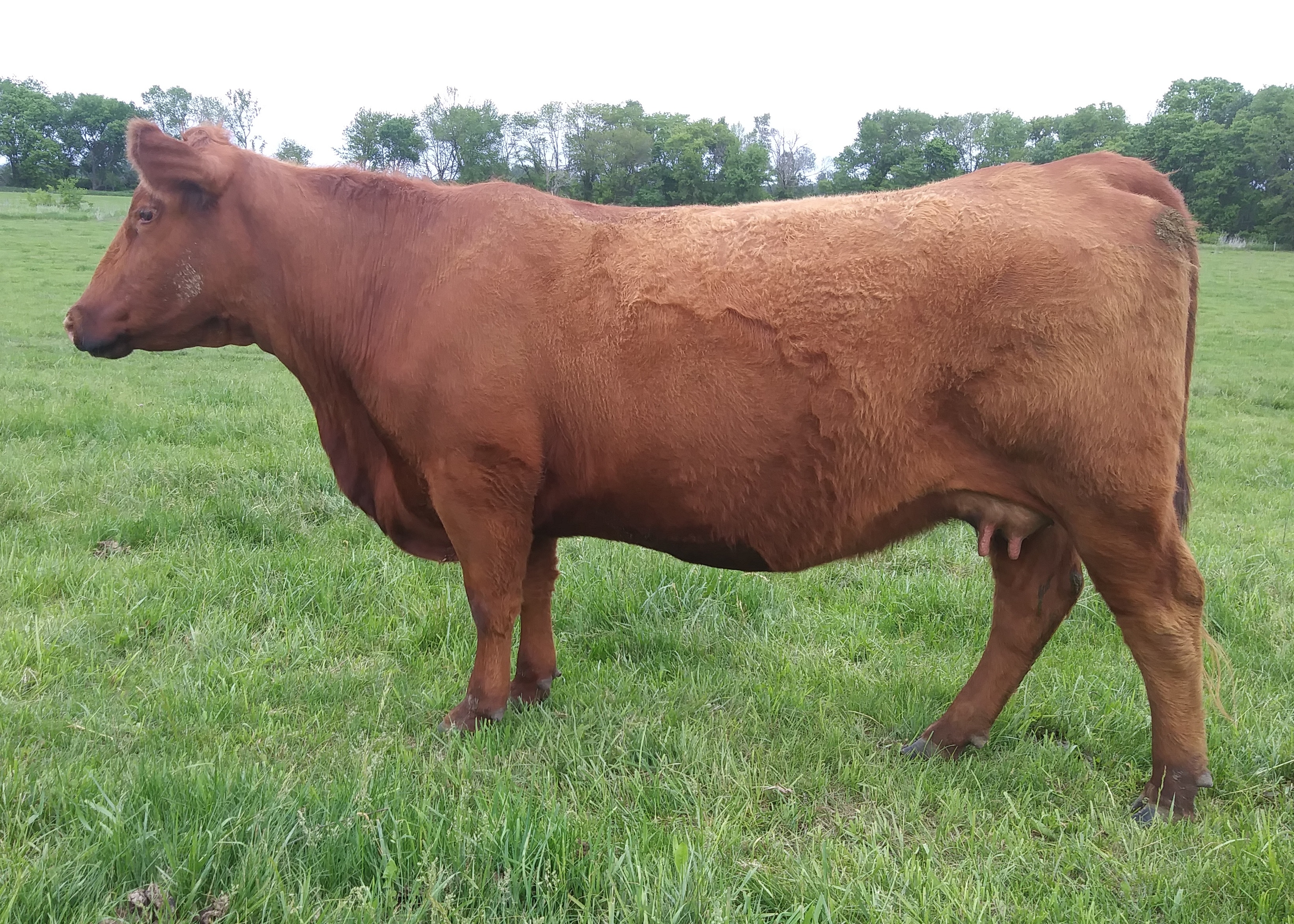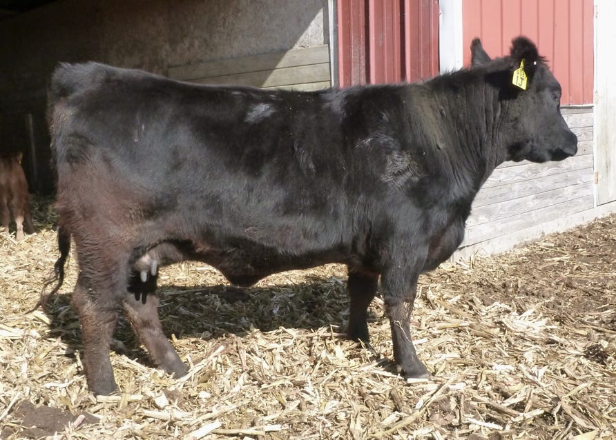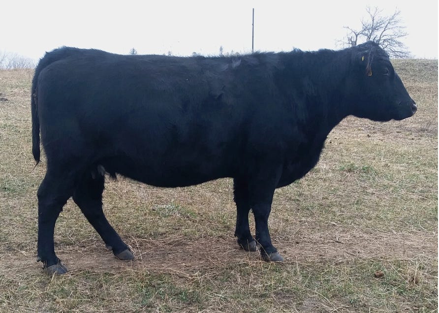 1J is another black, red carrier cow from the Allicia family, which all trace back to the high marbling Angus cow purchased from the Iowa State University Beef Teaching Herd. 1J is not only the highest marbling cow in our herd, but she is one of the highest in the entire Red Angus breed. She posted over a 9% IMF ultrasound measurement, and has one of the top marbling EPDs in the Red Angus breed. She has so much more to offer than just marbling, though, with excellent calving ease, growth, stayability, and even REA. Phenotypically, she is moderate framed, has been an easy keeper, has good feet and an excellent udder, and a great disposition. I just wish she had come out red. Even as a black cow, she has put herself on the fast track to being a donor, and we hope to get a number of great red daughters from her to make the Allicia cow family a bigger part of our red herd. She was flushed to BB Propulsion 9096 with heifer sexed semen.