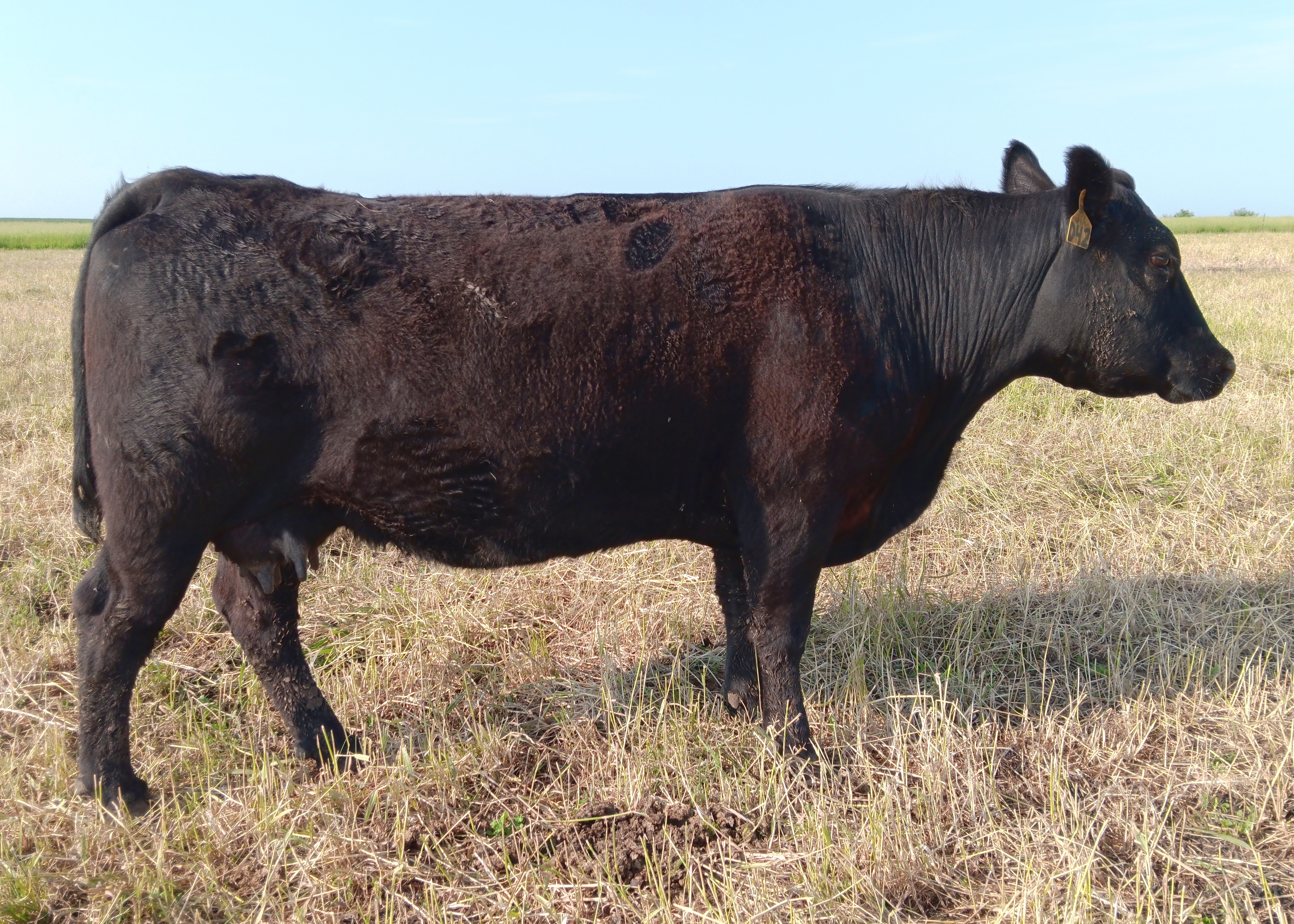 H34 is a cow that we have had high expectations for since she was a calf. She has an awesome pedigree, combining Stockmarket with our Lena U47 donor matriarch. The combination of those two parents has given her a terrific set of EPDs across the board. Her first bull calf was a moderate, stout made Energize son who sold to Kirk Nelson from Cherokee, IA.