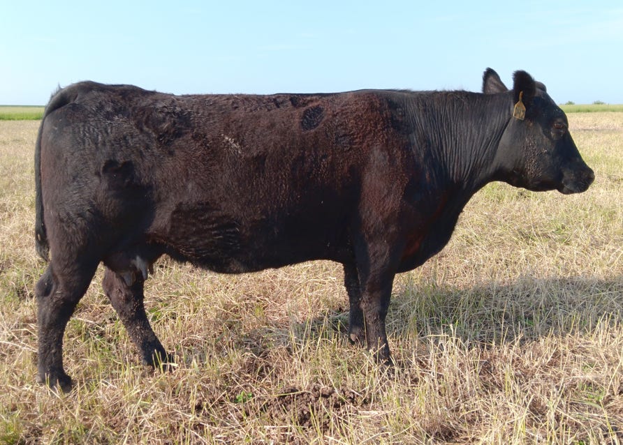D82 is another cow from our Marita cow family who has done a great job for us. This cow family all trace back to R31 (profiled above) who was Samurai’s dam, and they make up a significant portion of our herd. D82 has raised high growth calves for us, posting an average weaning ratio of 113 and an average yearling ratio of 111. Her 2022 daughter by Energize is a terrific young cow in our herd, and her daughter M11 (D82’s grand daughter) was our best heifer in the 2024 crop.