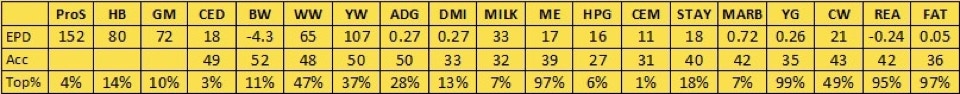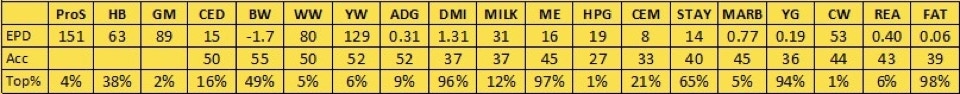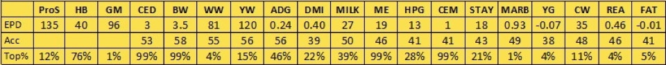 B97 has risen to the surface as one of our top cows, as well as now being one of our oldest cows in production. She is one of our favorites from a terrific set of flushmate sisters, out of Epic and our R31 donor, which makes her a maternal sister to Samurai. B97 is a deep bodied cow with an awesome disposition and impeccable feet. She has a great spread from low birth to high growth, with her calves’ average birth ratio of 98, average wean ratio of 103, and average yearling ratio of 105. She has shown great fertility as well, settling AI in the first cycle in all of her first 9 years. Unfortunately that streak came to an end in 2022, but she still settled on the second cycle, and in 2023 she started a new streak. We skipped over B97 and flushed her daughter E40 (profiled above), but I wouldn’t be shocked if we still flushed B97 at some point before her career is over.