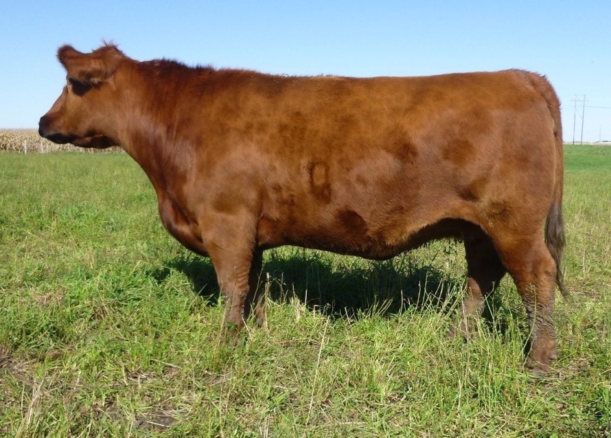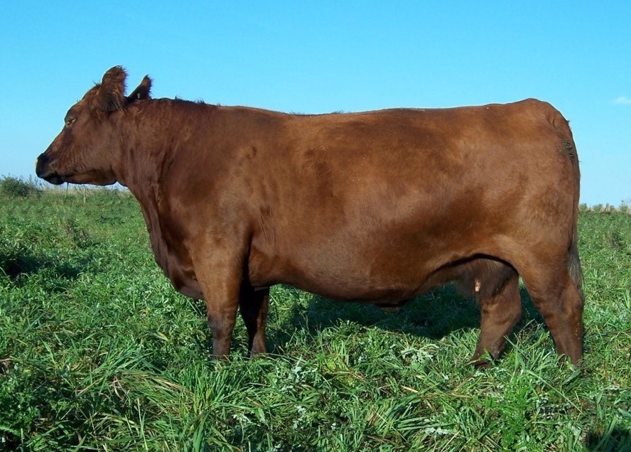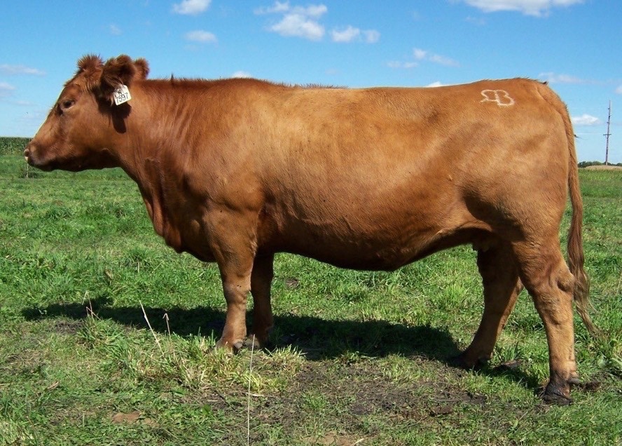 T75 is a black, red-carrier, outcross cow that is a product of our embryo program. Her sire, ISU Imaging Q 9111, is an Angus sire that was produced by Iowa State University in the high marbling breeding program at their Rhodes farm. Gene helped oversee this breeding project while he was on the Iowa State faculty, and wanted to bring in some of these top black genetics to our Red Angus herd. T75 has done a great job of that. She has consistently produced heavy weaning weight calves, earning an impressive 108 MPPA. She was a feminine, attractive, high milking cow with great feet and udder and was a consistent producer until she was 13 years old. She has been flushed to Beckton Epic R397 K, and LCOC High Noon A093R.