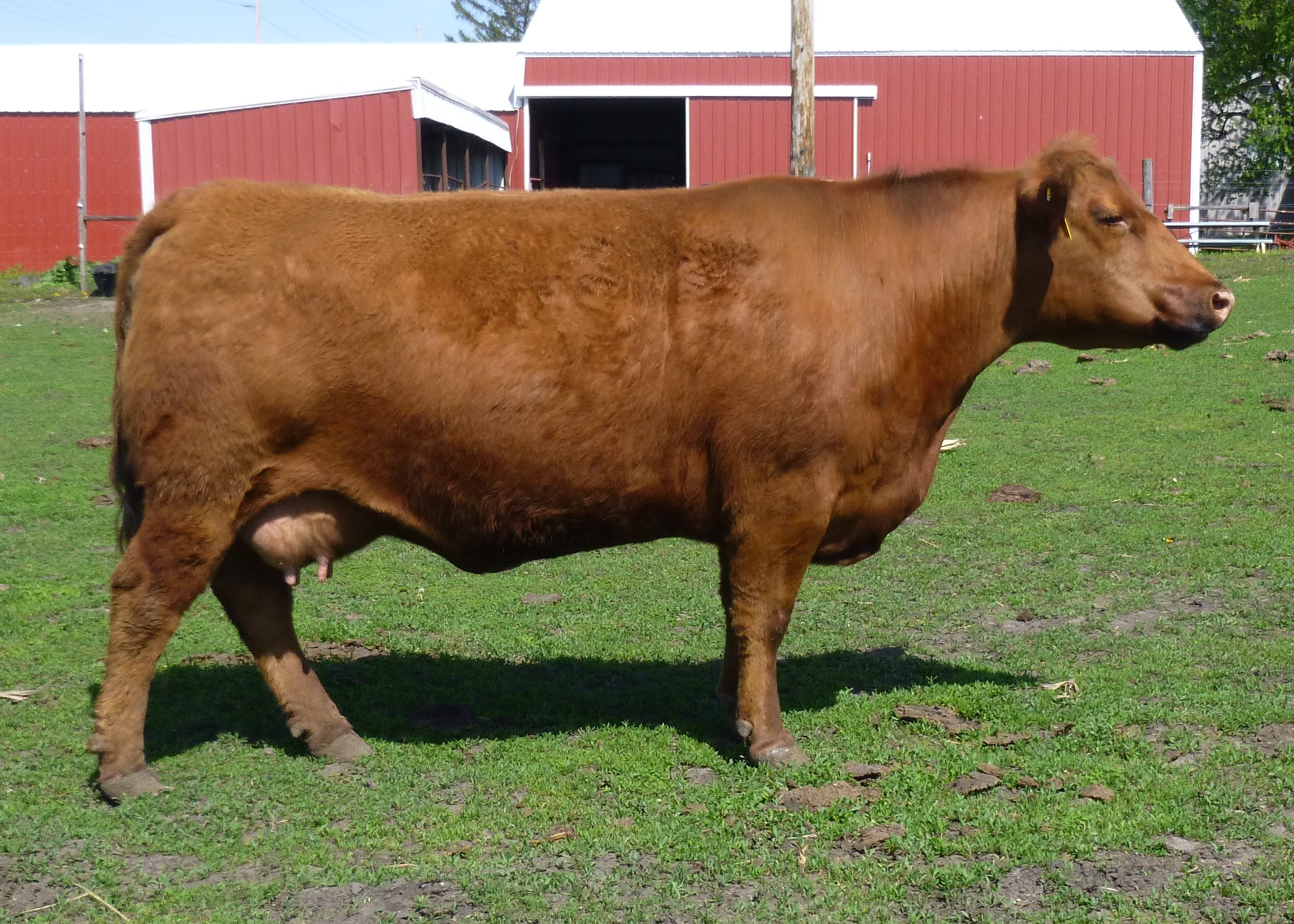 E40 is a granddaughter of R31 above and sired by Deep End. Her dam B97 is also profiled further down the page. She is a dark red, large framed cow with growth at the top of the breed. She has done a great job raising calves (as evidenced by her 107 MPPA), including her first calf, G12 who was easily the most impressive heifer we had that year. E40 has also done a great job getting bred in the first cycle every year just like her mother. She has been flushed to Bieber Blue Chip H302.