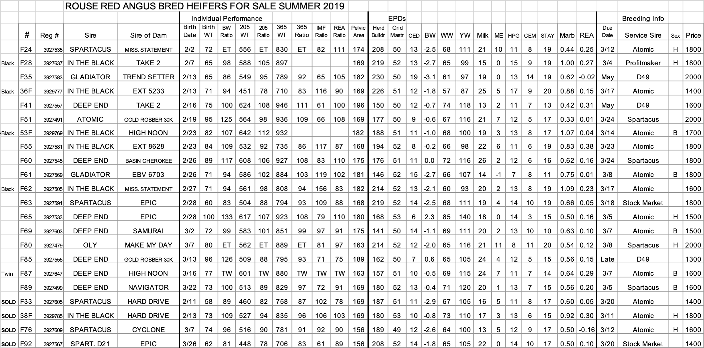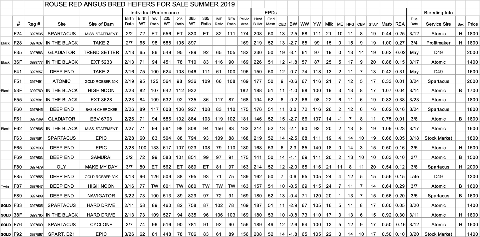 We are once again offering the following group of heifers for sale by private treaty. We have more good heifers than we have room to keep here, and we feel these 22 heifers will make excellent cows. They have all been 50K tested, and those results are now reflected in their EPDs. We have collected all of our yearling data, including yearling weights, carcass ultrasound, and pelvic area measurements, and those are included in the data sheet now as well. We started breeding them on June 1, AIing on natural heats for the first cycle, and have our Stormy 49D clean up bull running with them now. We have done an initial pregnancy check on the heifers and were able to confirm that most of them settled AI, and have indicated that on the data sheet along with the sex of the calf if known. The three heifers who didn’t will have to be checked again this fall to confirm their pregnancies. The heifers were AI’d to Atomic, Spartacus, and Stock Market, and more information about those sires can be found on the Herd Sires page. Feel free to call or email if you have any questions. We would be happy to show them to you!
