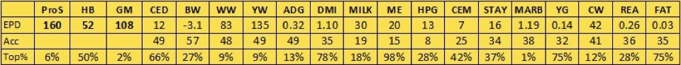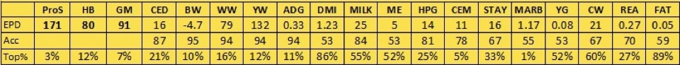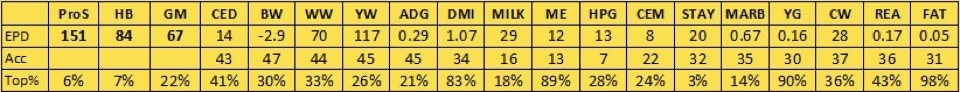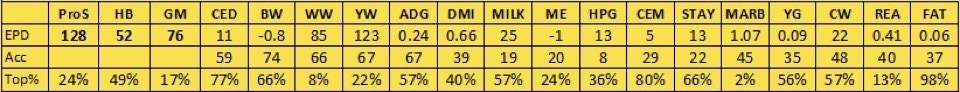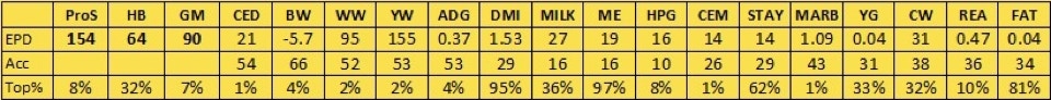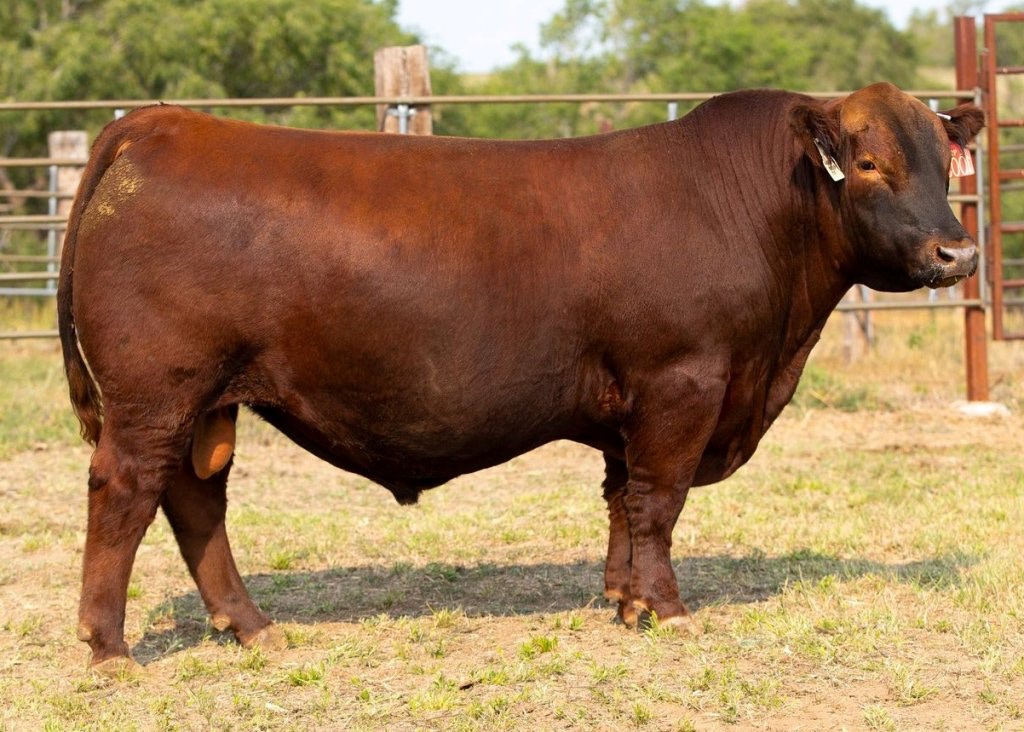 Paycheck is a bull that Biebers bought from Lundgren Angus Ranch in Kansas. He offers a different pedigree that is unrelated to most of our lines. We seriously considered using Paycheck several years ago, but ultimately went another way. His first set of sons sold at Biebers’ 2023 sale and they were the standout sire group of the entire sale. In fact, the top four high sellers were all Paycheck sons. We didn’t want to make that mistake again, so we made it a priority to use him in 2023. Unfortunately Paycheck is deceased and there is a very limited amount of semen left, but fortunately, we had excellent luck with our limited use, getting 17 pregnancies from 20 straws. Paycheck is one of the very highest WW and YW EPD bulls in the entire Red Angus breed, but is able to do that while keeping frame size in check. He also boasts both marbling and ribeye area at the top of the breed.