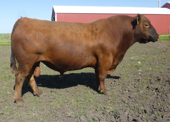 Spartacus is a son of Samurai who was the high selling bull in the 2014 Bieber Red Angus Production Sale. Spartacus is a stout boned, thick, deep bodied bull with a great disposition and feet. He has been a very good calving ease sire for us. His calves have great vigor at birth, which is a hallmark of the Samurai calves as well. We used Spartacus for 5 years, but have moved on to the next generation, using some of the many great Spartacus sons available, including Trojan, Maximus, In The Black, and Gladiator. The only thing keeping us from using this sire line any harder is the number of females in our herd who are already related to him, but rest assured that the Spartacus line will continue to be well represented in our herd.