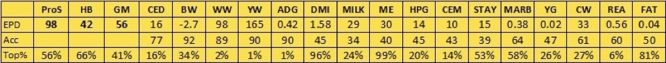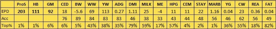 After four years of Stockmarket dominating our sire line-up, it finally came time to move on, but in 2023 we didn’t move too far. Blue Chip was our pick of all the great Stockmarket sons out there. He offers the same do-it-all EPD profile of his sire, with an extra emphasis on calving ease. We certainly appreciate his high marbling, with his EPD at the top of the breed and his ultrasound ratio of 137. He is very long bodied, with extra muscle and style.