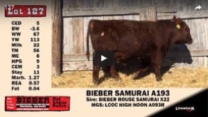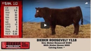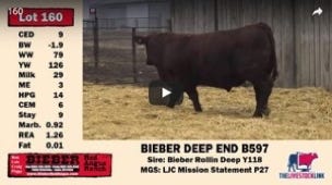 Rollin Deep was the high selling bull in Biebers’ 2012 sale. He is the leading son of Roosevelt, and his dam is one of the very best cows to come out of Biebers’ herd. Rollin Deep has tremendous depth of body, thickness and a great overall phenotype. His calves have excellent growth and carcass, and his daughters make top notch cows. Much like his sire, Rollin Deep’s sons have been very well received by commercial cattlemen and purebred breeders alike. Rollin Deep semen is hard to come by now, and going forward we will only have a limited number of Rollin Deep progeny coming from our ET program.