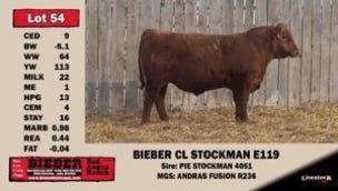 Stockmarket is the leading son of Stockman who was the second high seller in the 2018 Bieber Spring Sale. He is a grandson of our Bieber Adelle 297Y donor cow. Stockmarket posts the kind of do-it-all EPD profile that we are striving for in our herd, with heifer safe calving ease, top of the breed growth, strong maternal predictions, and high end carcass traits. We just love our Stockmarket calves and now that we have some daughters in production we like him even more. His sons have been some of the most sought after bulls in the breed the last few years. He was our most used AI sire for four consecutive seasons. We still feel like he is as good of a bull as there is in the breed, but we have had to move away from using the Stockmarket line of sires just because many of our customers need some unrelated bloodlines to use on their Stockmarket influenced cattle.