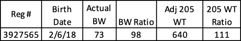 We have been very happy with our In The Black calves, and we have kept almost all our red daughters back as replacements, but don't want to get too many black cows in our red herd. All three of these heifers would have made our keeper pen if they had turned out red as well. This heifer had one of our heaviest weaning weights, posting a 112 weaning ratio. Her dam has done a great job of raising low birth weight and high weaning weight calves, with her 6 calves averaging a 92 birth ratio and 110 weaning ratio.
