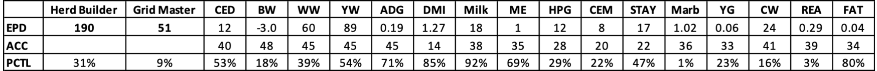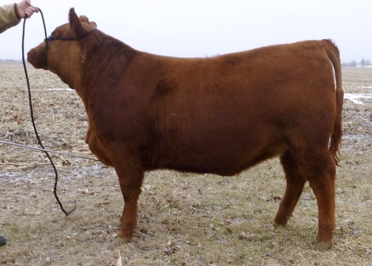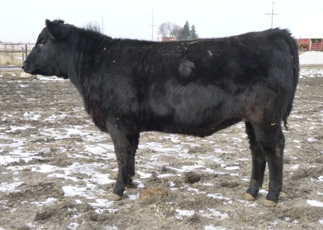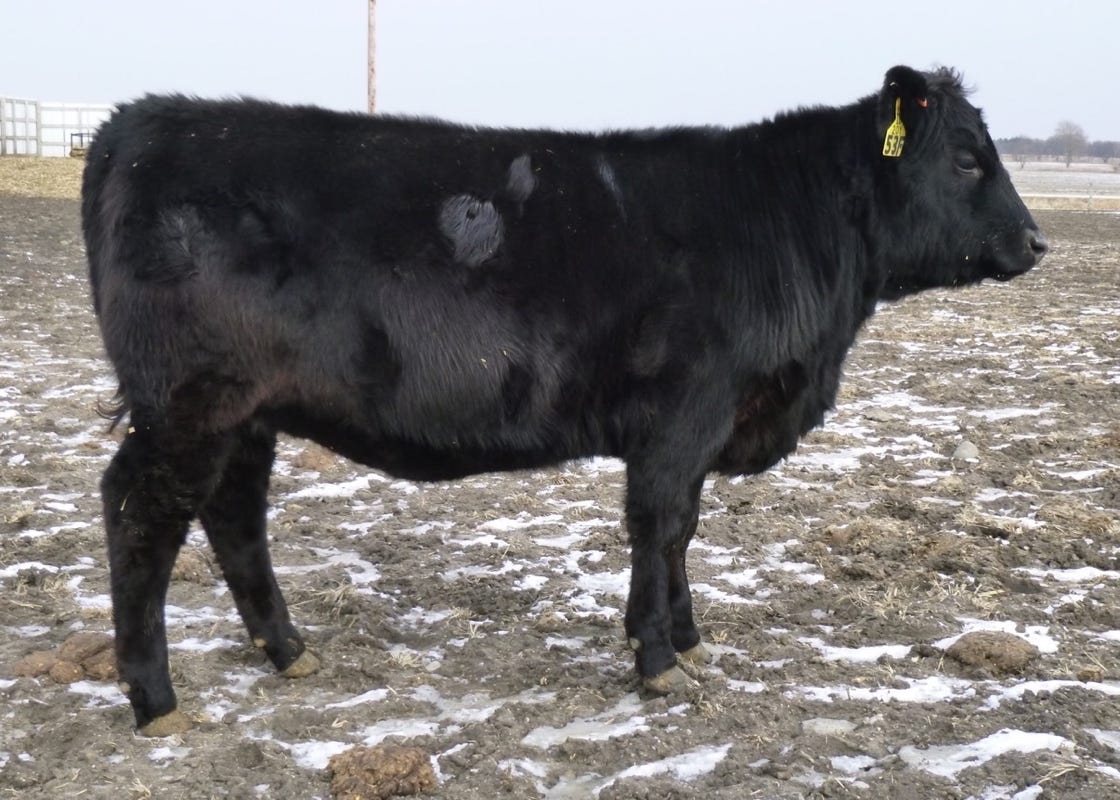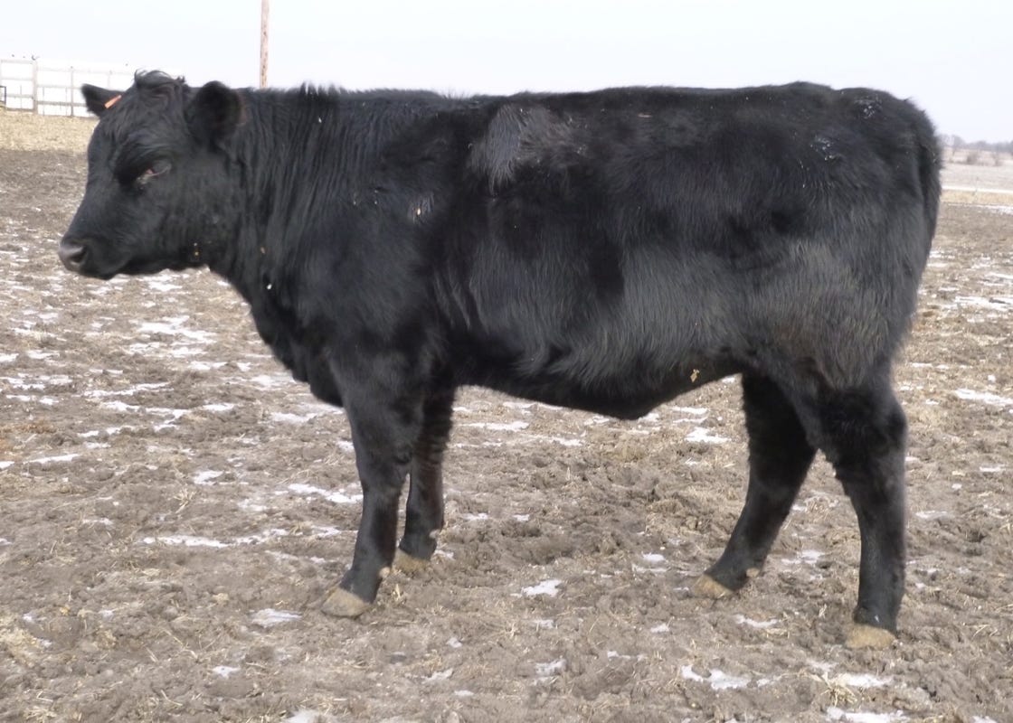 These three heifers are all registered Red Angus, despite the fact that they are black. They all carry the red gene, and would have a red calf half the time when bred to a red bull. This heifer has a really good set of EPDs that put her in the top 10 % of the Red Angus breed for both the HerdBuilder (maternal) index and the GridMaster (terminal) index. The Lena cow family is one of the best in our herd, and we are currently flushing her grand-dam, A02.